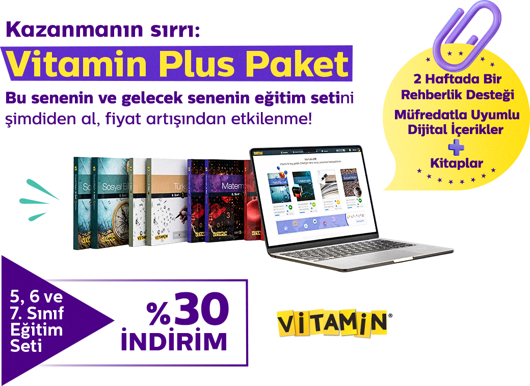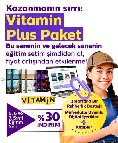 Öğrencilerin online eğitim gereksinimi aynı zamanda 8. sınıf online deneme ve 8. sınıf online kurs ihtiyacı da bu çok boyutlu öğrenme ortamında karşılanır. Vitamin Kitapları 8. sınıf kaynak kitap olarak eğitim öğretim yılı boyunca öğrencilerin yanındadır.